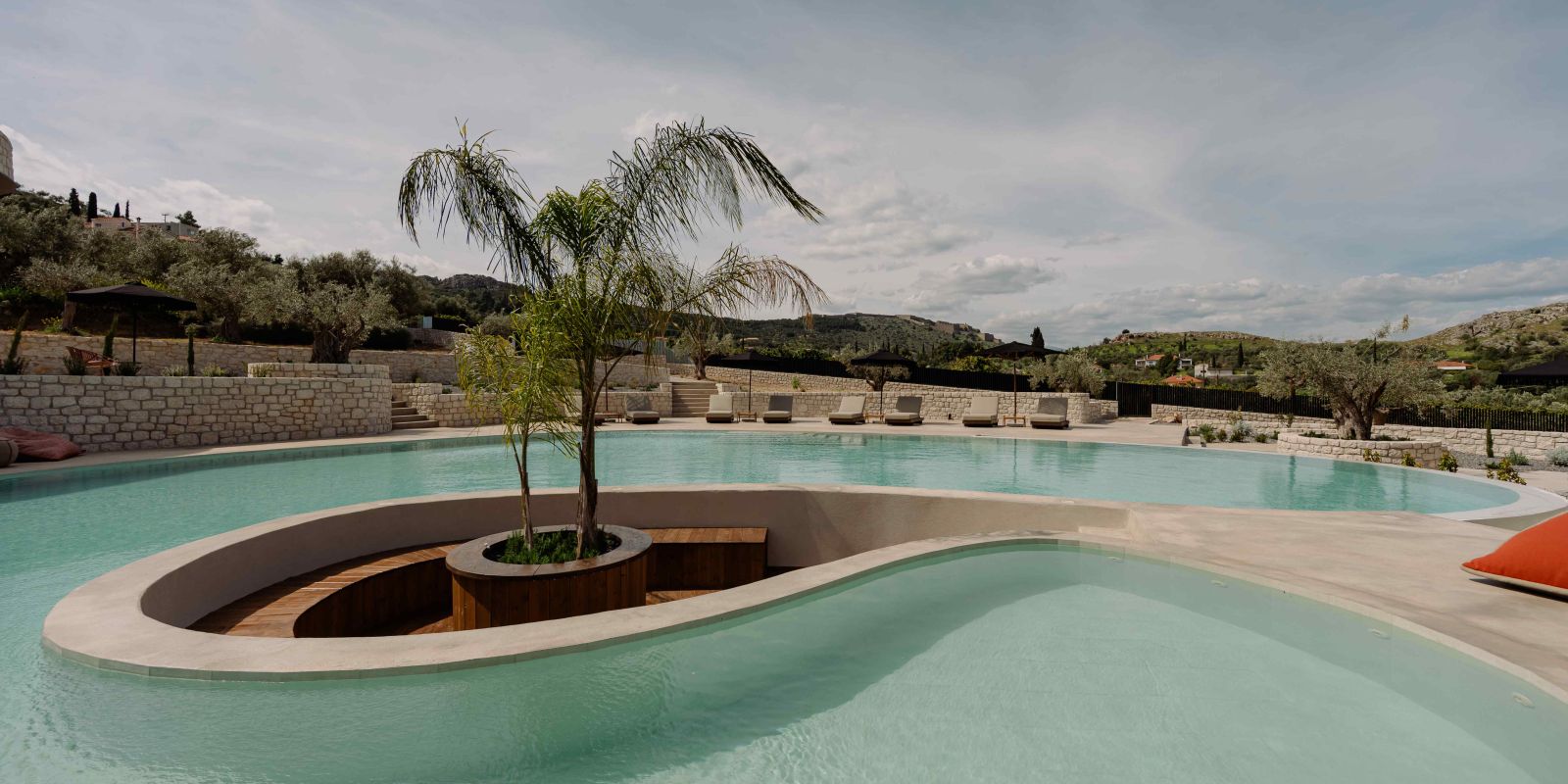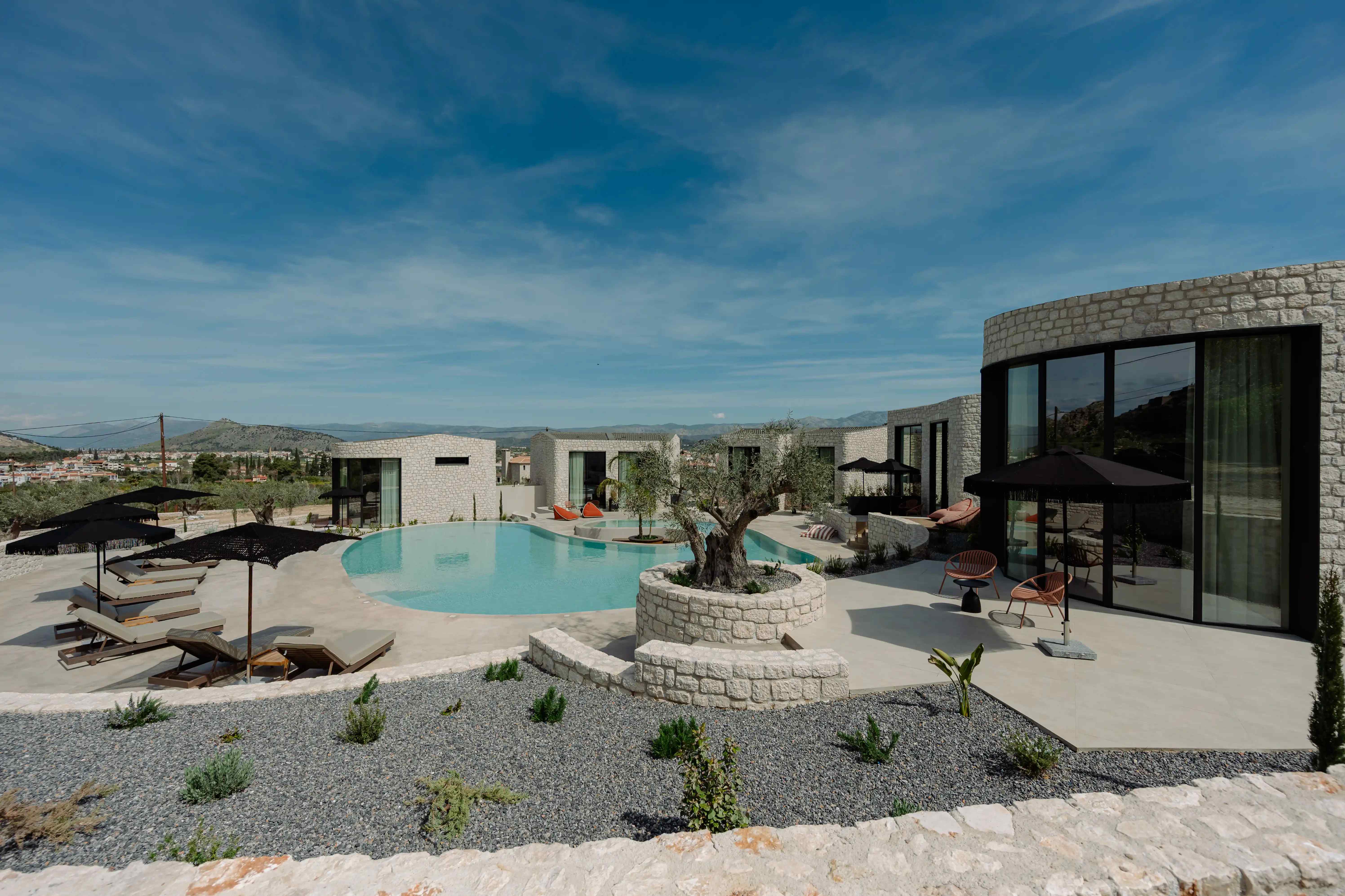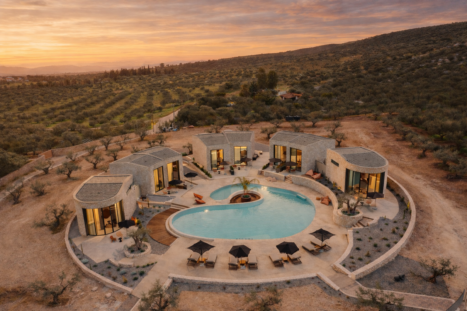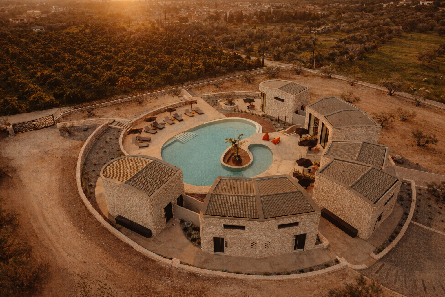 The volumes, defined by soft curvatures and a solid material presence, are inscribed within the circular layout, establishing a coherent morphological language. Stone cladding and earthy tones anchor the project within the Mediterranean context, while the preservation of existing vegetation reinforces the continuity of the natural landscape.