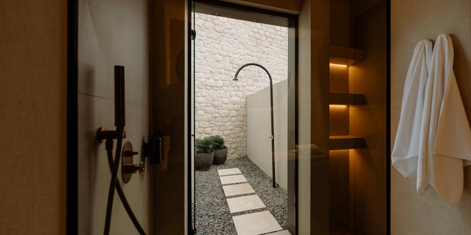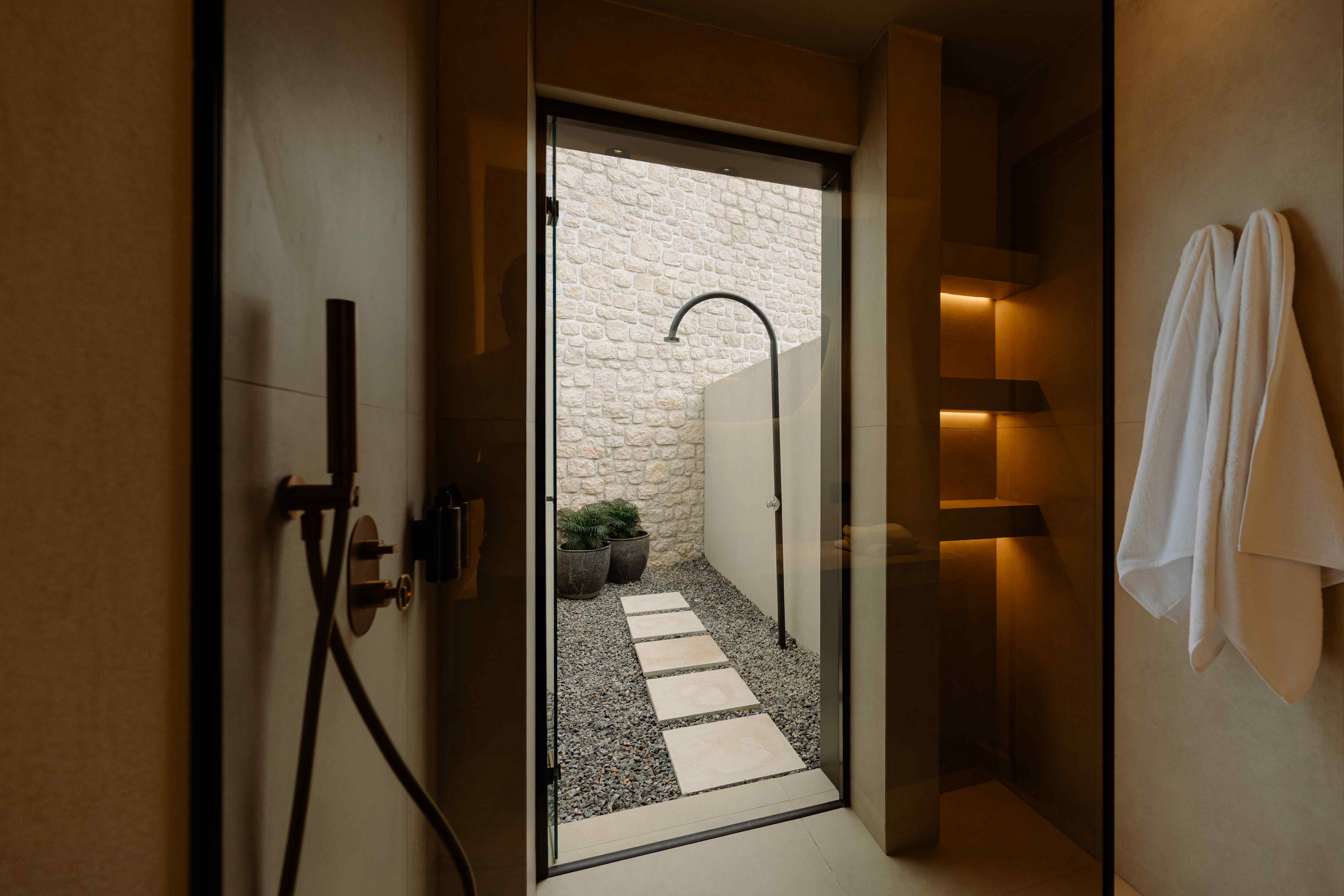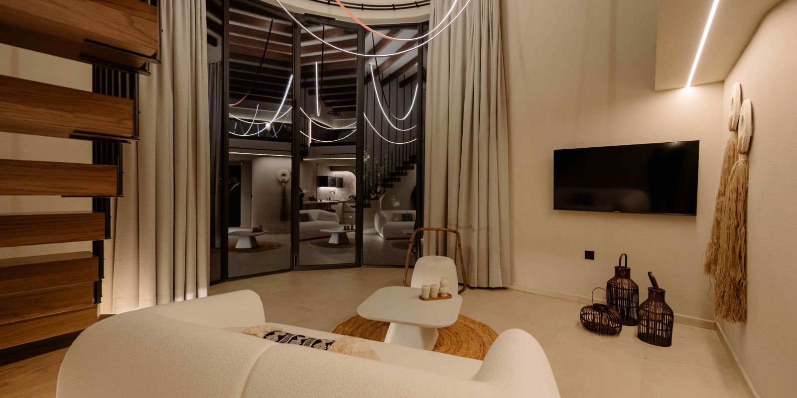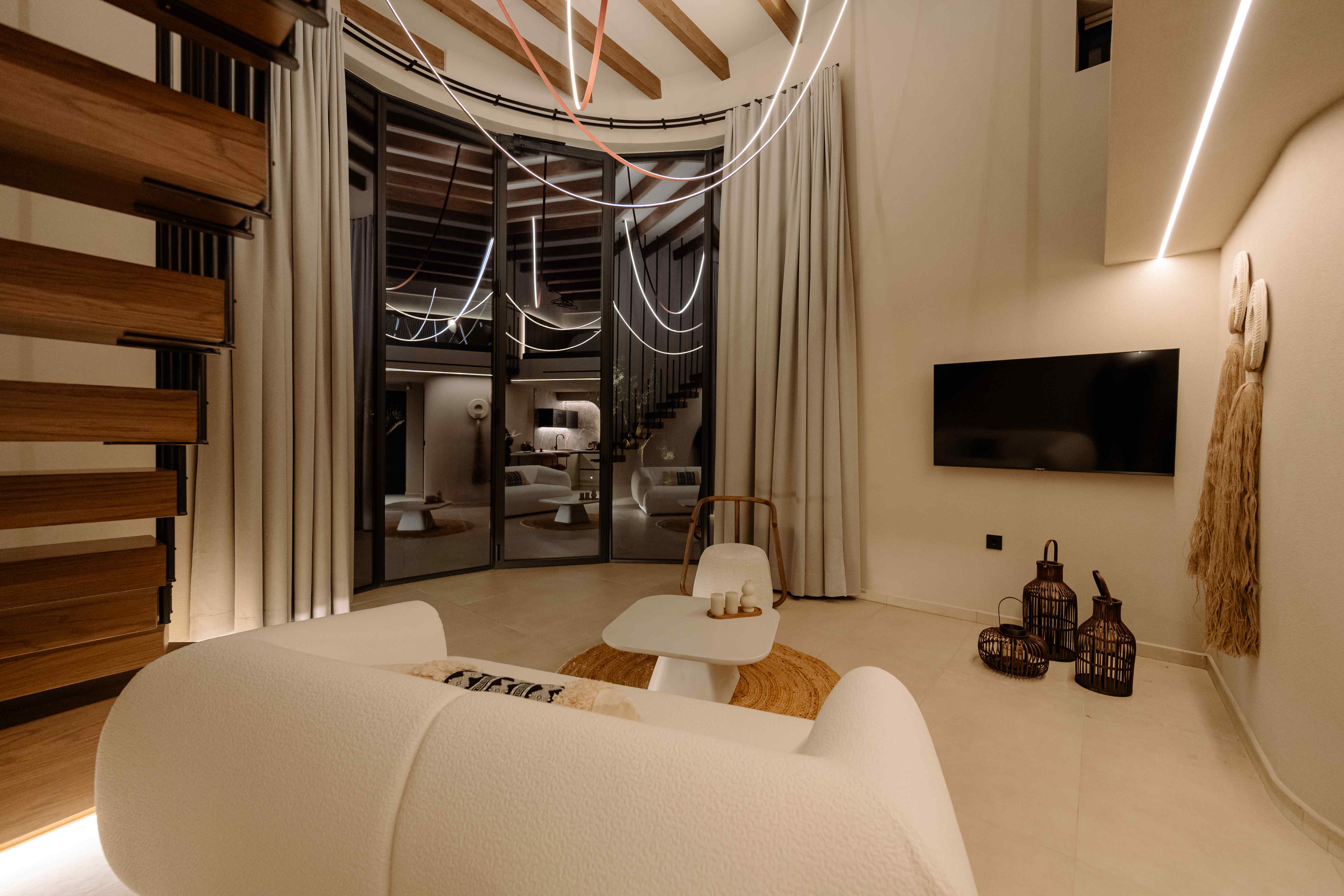 The volumes, defined by soft curvatures and a solid material presence, are inscribed within the circular layout, establishing a coherent morphological language. Stone cladding and earthy tones anchor the project within the Mediterranean context, while the preservation of existing vegetation reinforces the continuity of the natural landscape.
