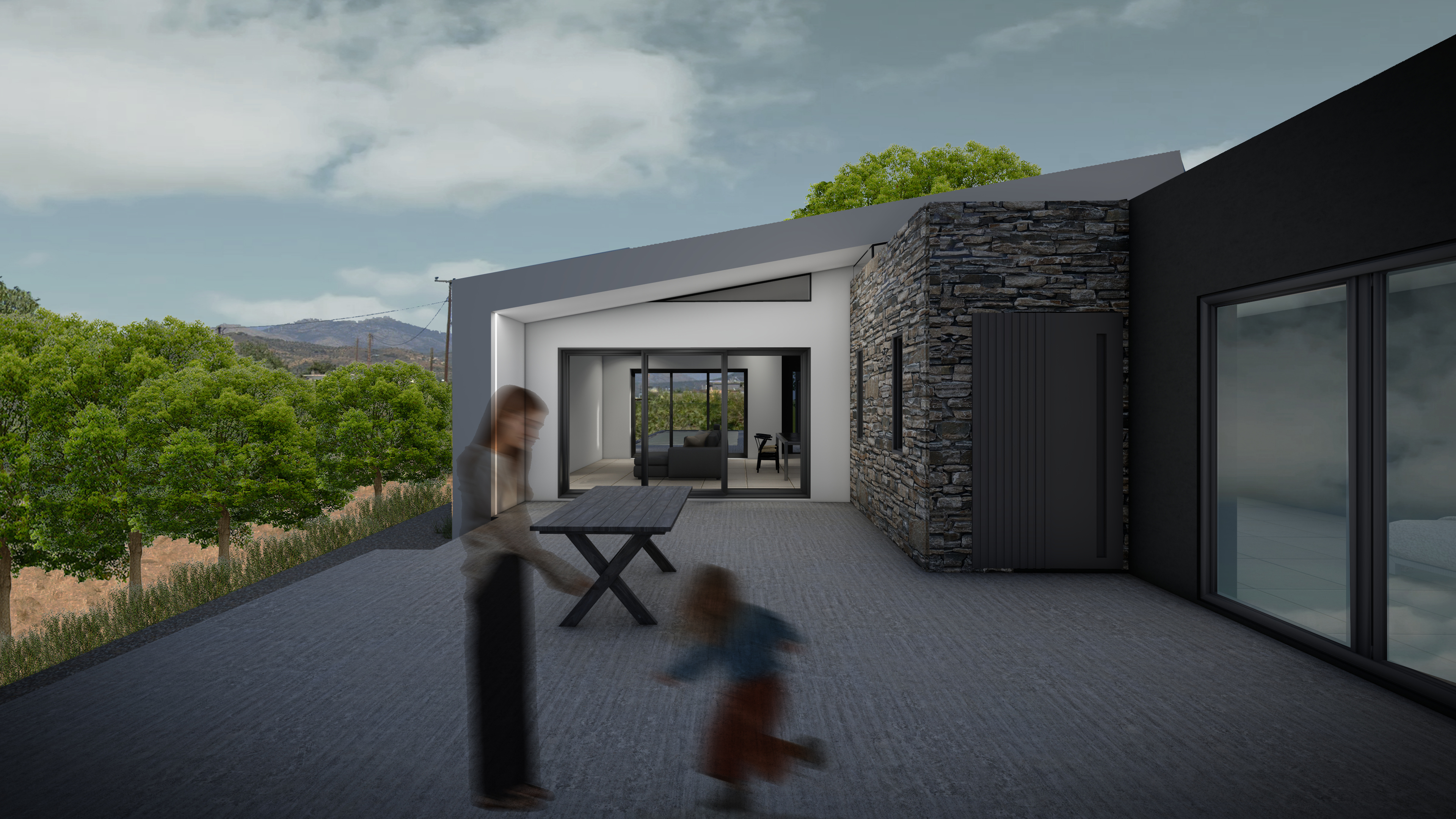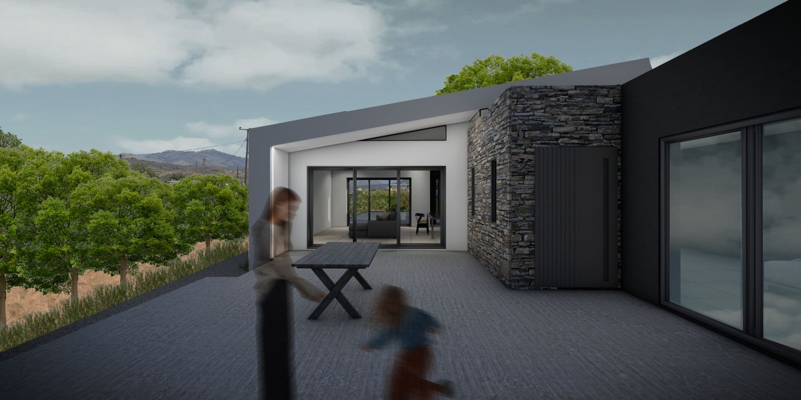 The geometry remains minimal yet expressive. The sloping rooflines introduce a sense of movement, guiding the gaze towards the distant horizon. Materials are chosen to maintain balance: cool metal and warm stone, solid concrete and the transparency of glass.
