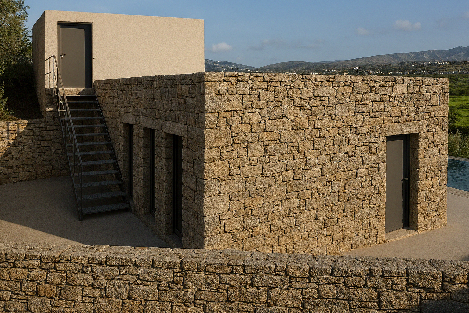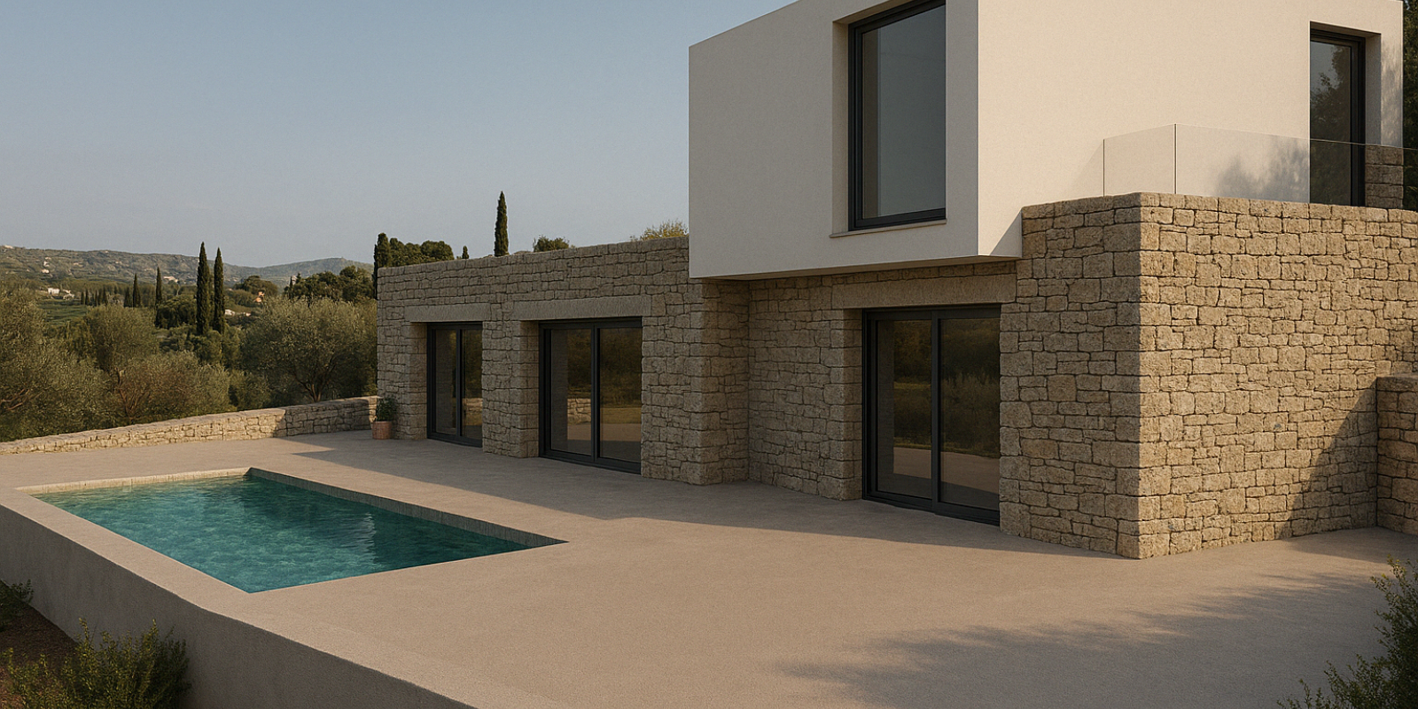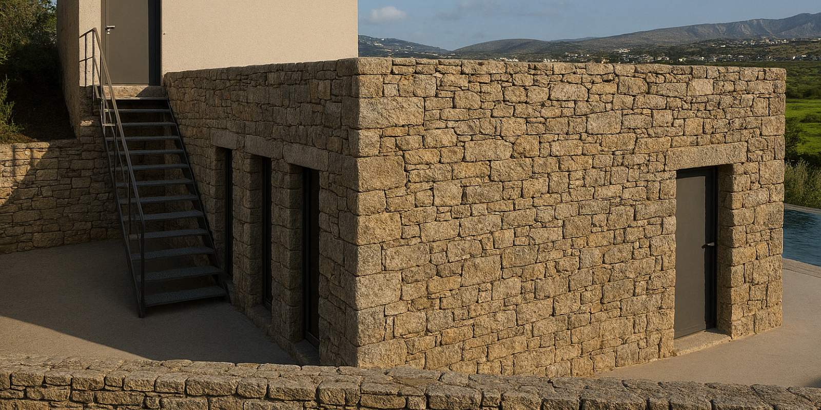 The choice of materials – natural stone masonry, exposed concrete, and metal-framed windows – achieves timelessness, environmental harmony, and functional simplicity. The architectural rigor is softened by the tactile warmth of the stone and the earthy tones of the outdoor setting.
