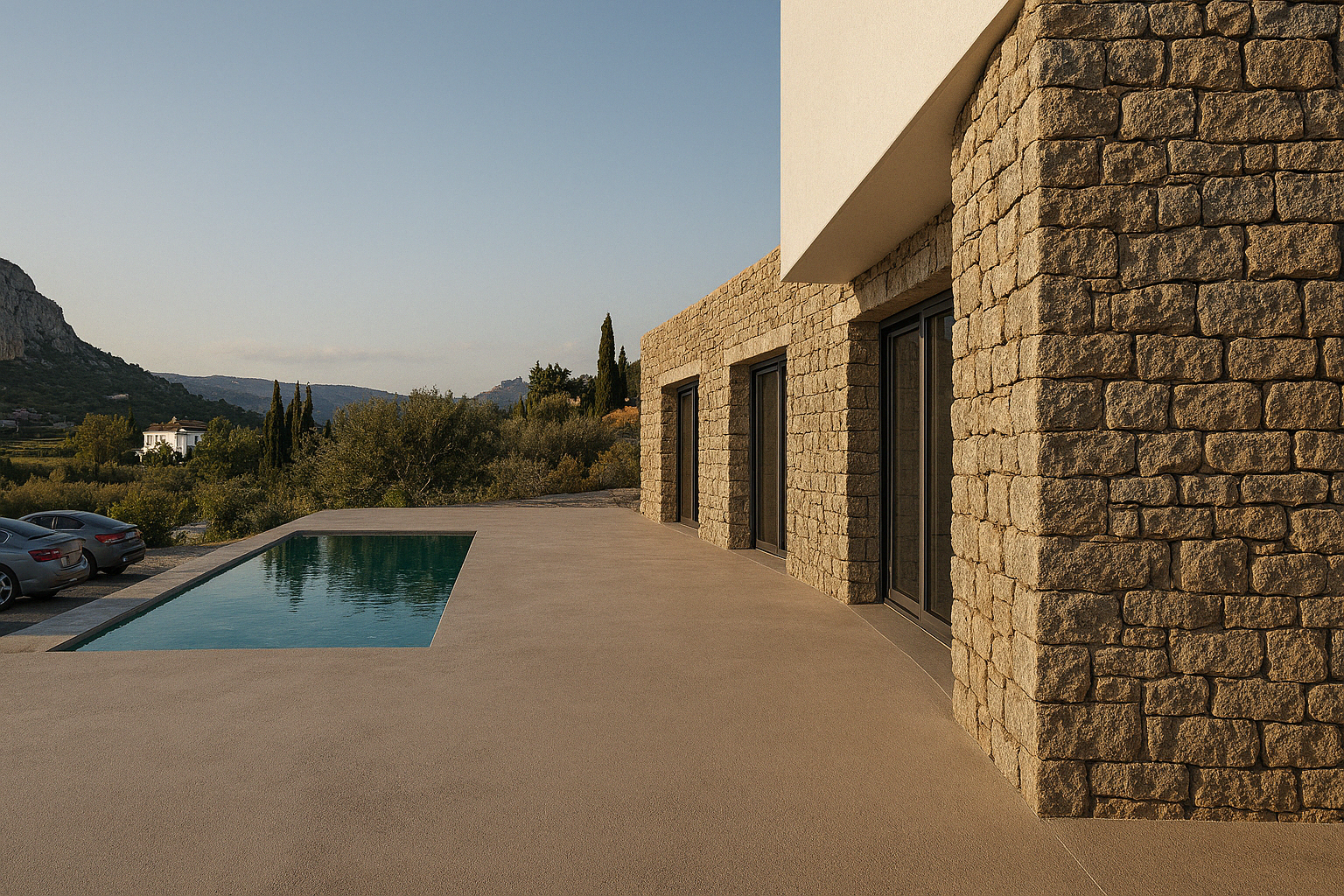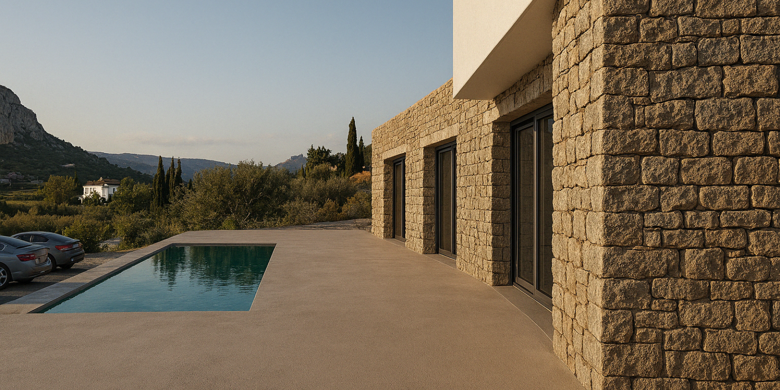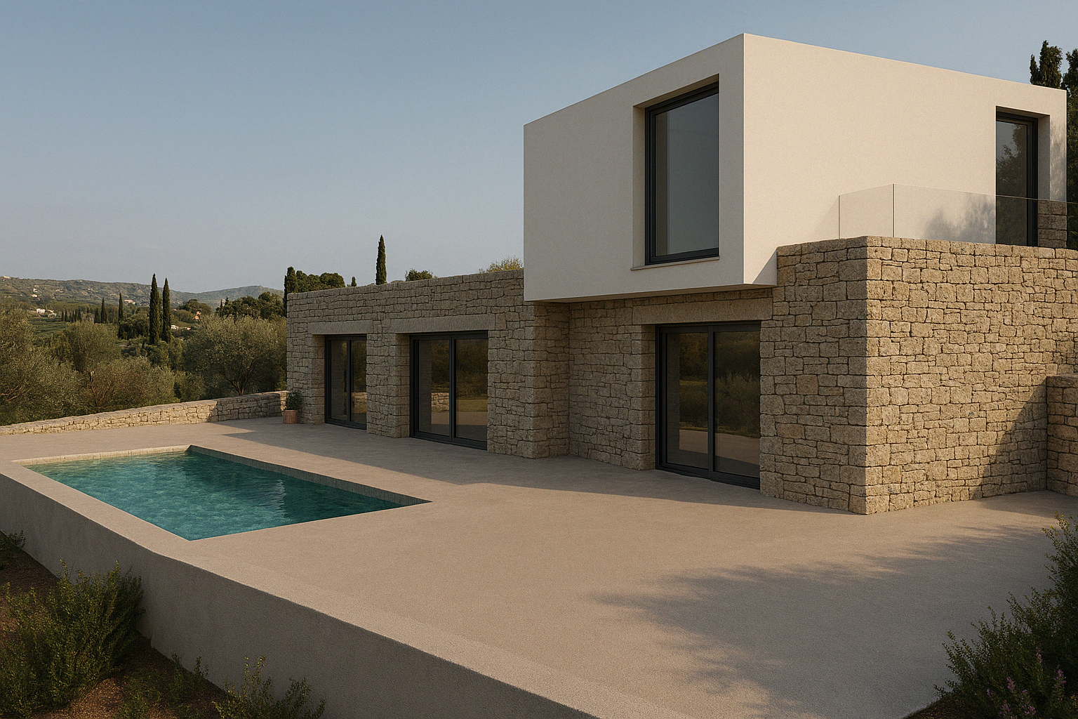 The choice of materials – natural stone masonry, exposed concrete, and metal-framed windows – achieves timelessness, environmental harmony, and functional simplicity. The architectural rigor is softened by the tactile warmth of the stone and the earthy tones of the outdoor setting.