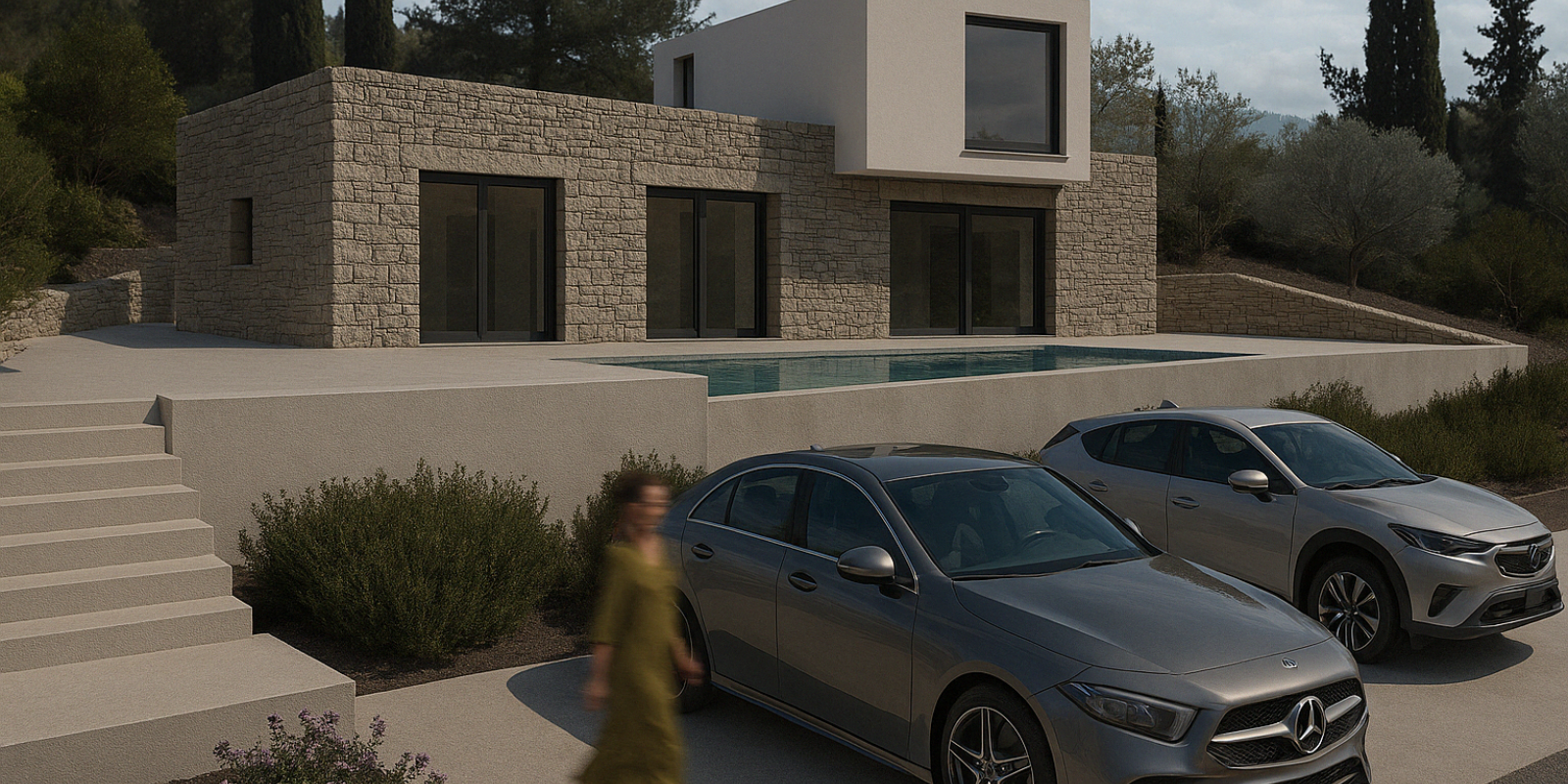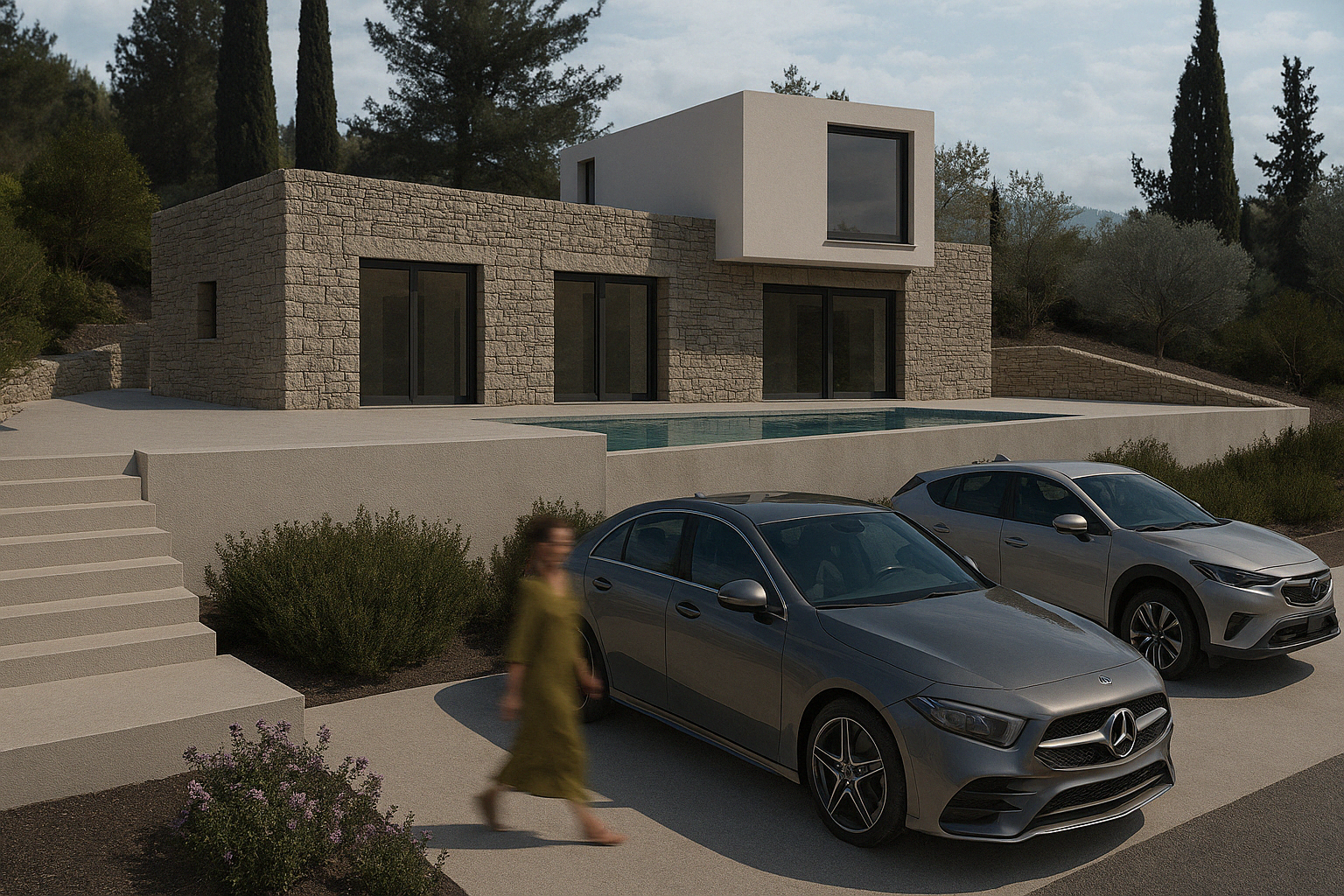 This residence is seamlessly integrated into the natural terrain, following a minimal yet bold compositional language. The architectural approach embraces the dialogue between traditional stonework and modern materials, forming a clean geometric composition. The ground level is expressed as a linear stone base, while the upper floor appears as a hovering white cubic volume above the entrance.