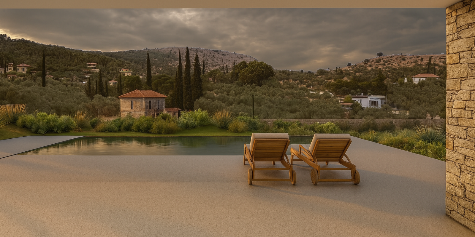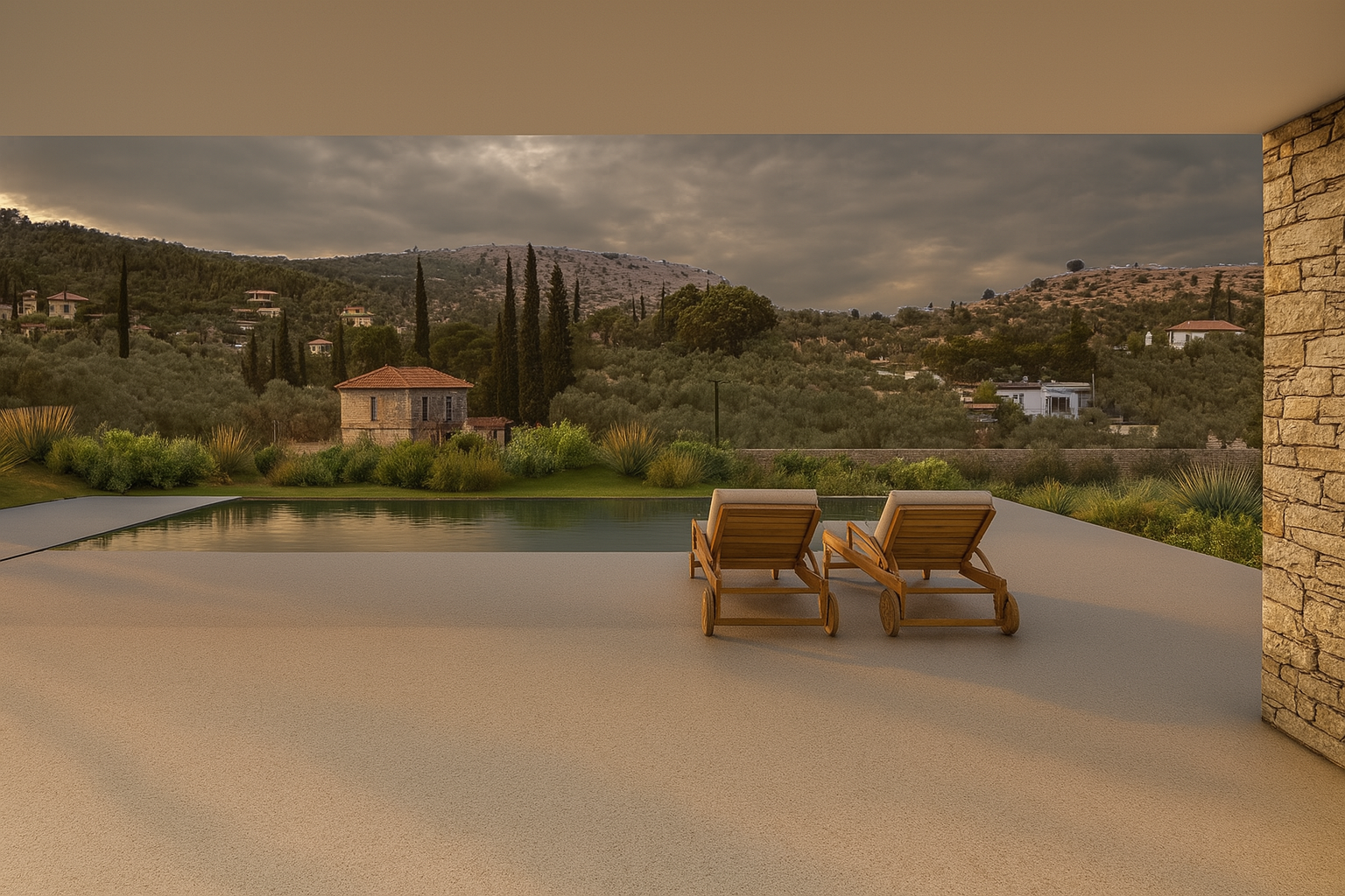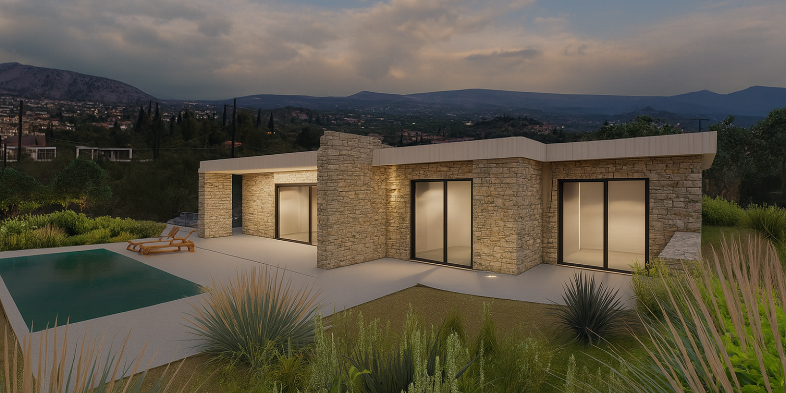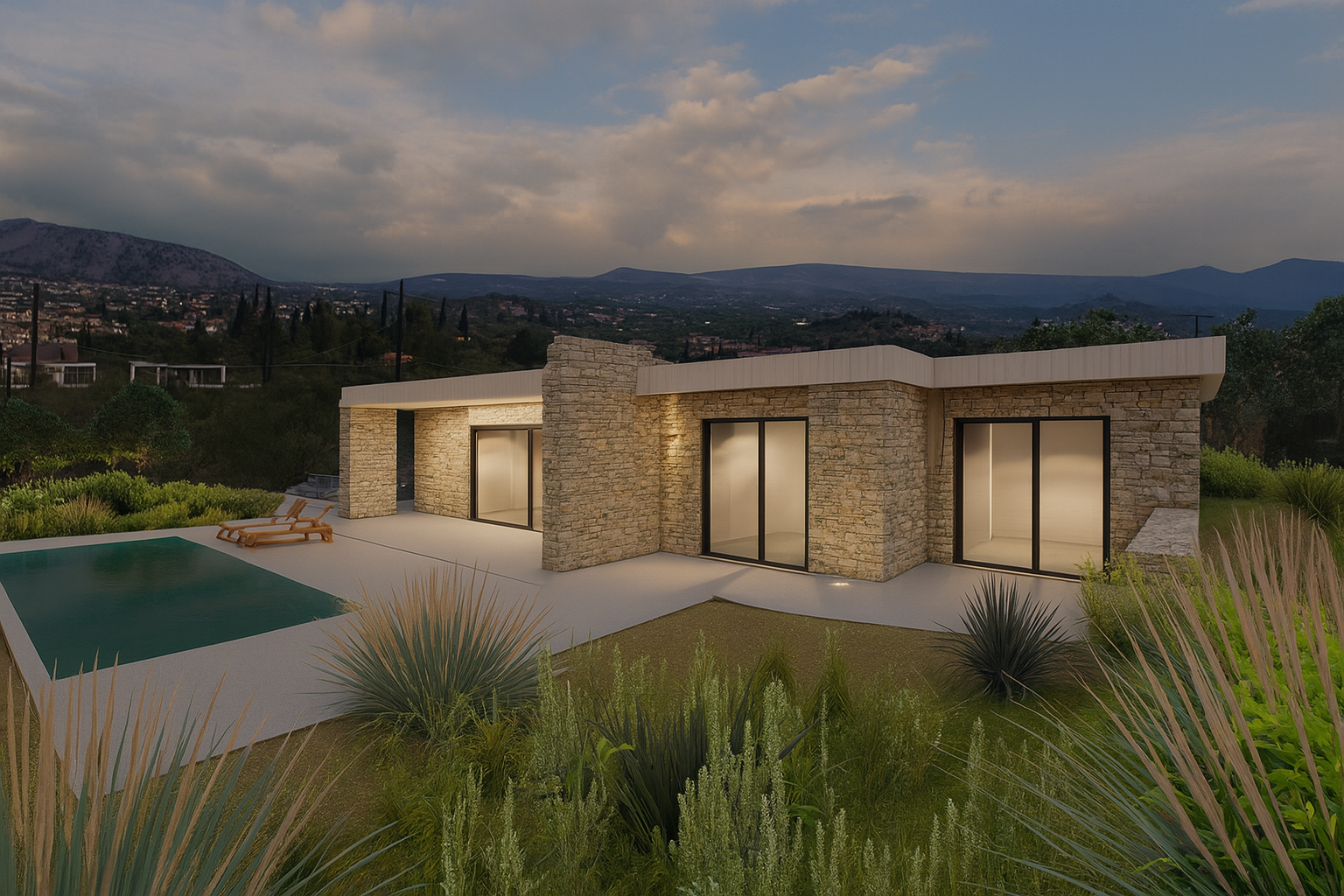 The design is organized around a central entrance axis, which leads directly to the outdoor area and the pool, offering visual continuity with the landscape from the moment of entry. The infinity-edge pool and expansive terrace with wooden sun loungers emphasize the experience of Mediterranean outdoor living and offer moments of relaxation with panoramic views of the surrounding hills.