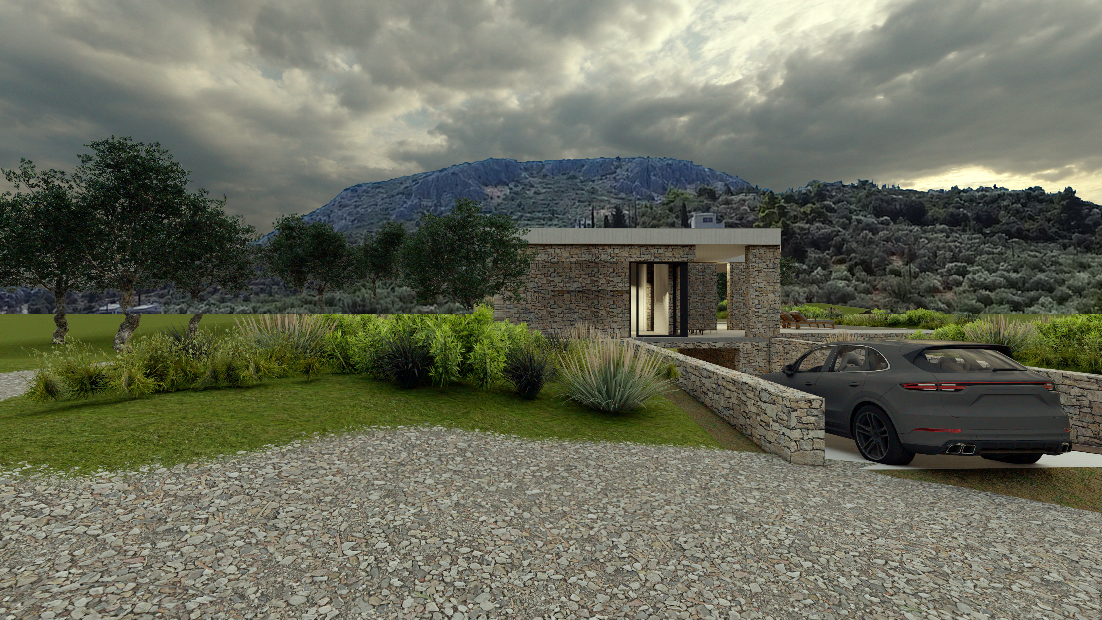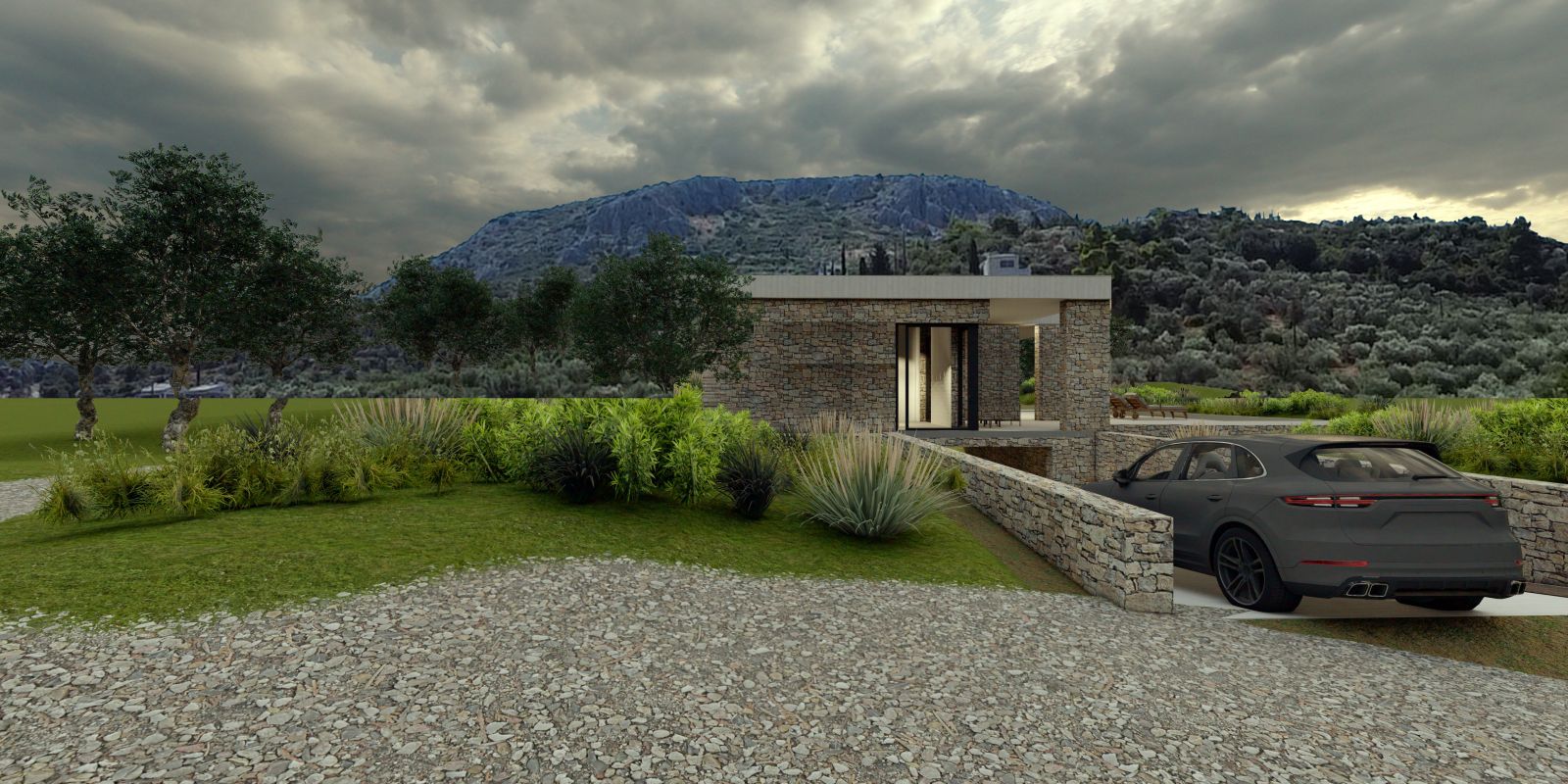 This single-storey residence unfolds gently across a softly sloping rural terrain, nestled within an olive grove and harmoniously integrated into the natural environment. The composition is defined by clean geometric volumes, minimal lines, and a strong horizontal orientation that follows the morphology of the landscape.