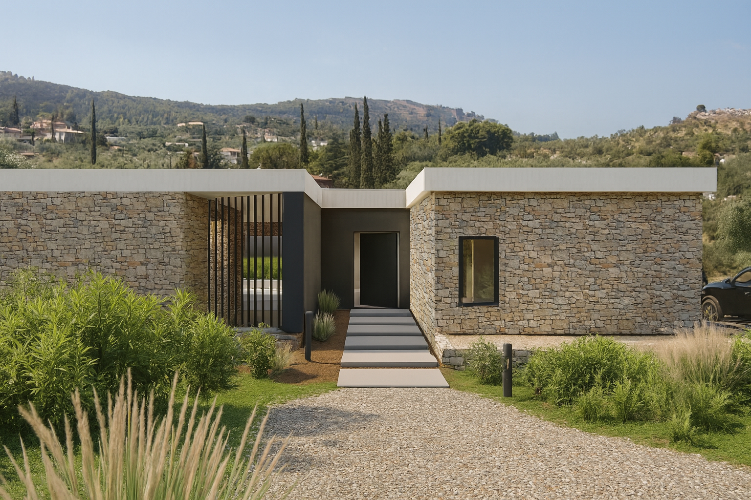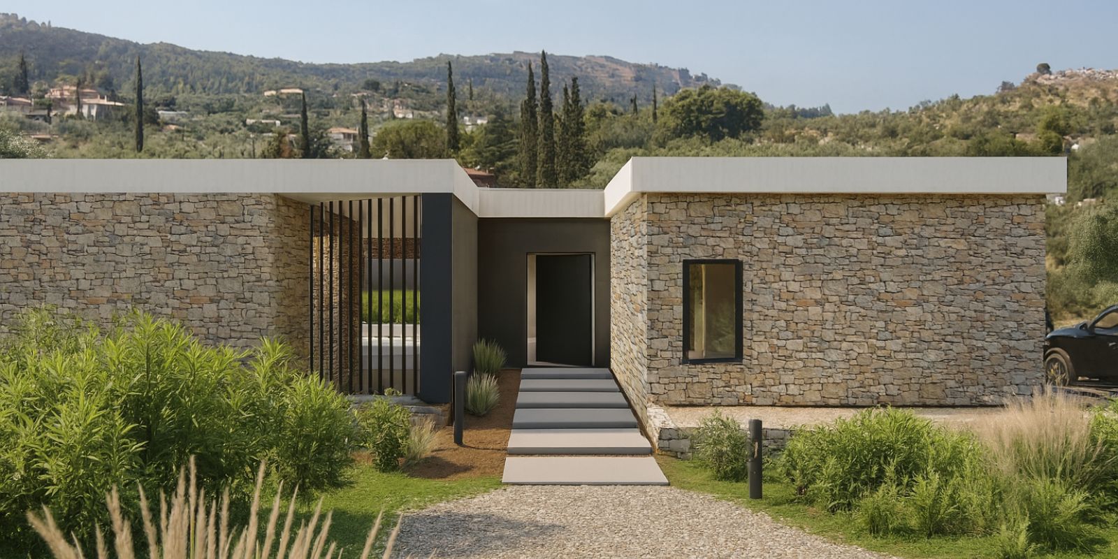 The stone-clad exterior pays tribute to local architectural traditions, while the use of modern materials such as metal and exposed concrete creates a balanced coexistence of the old and the new. The flat roof and large sliding glass openings enhance the contemporary aesthetic and ensure maximum transparency and interaction with the outdoors.