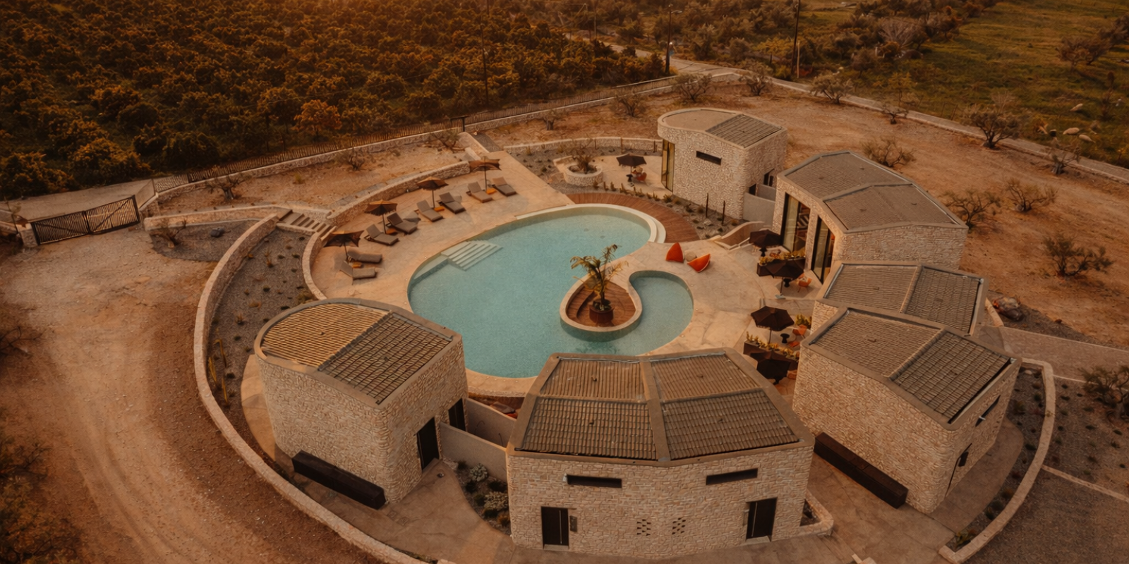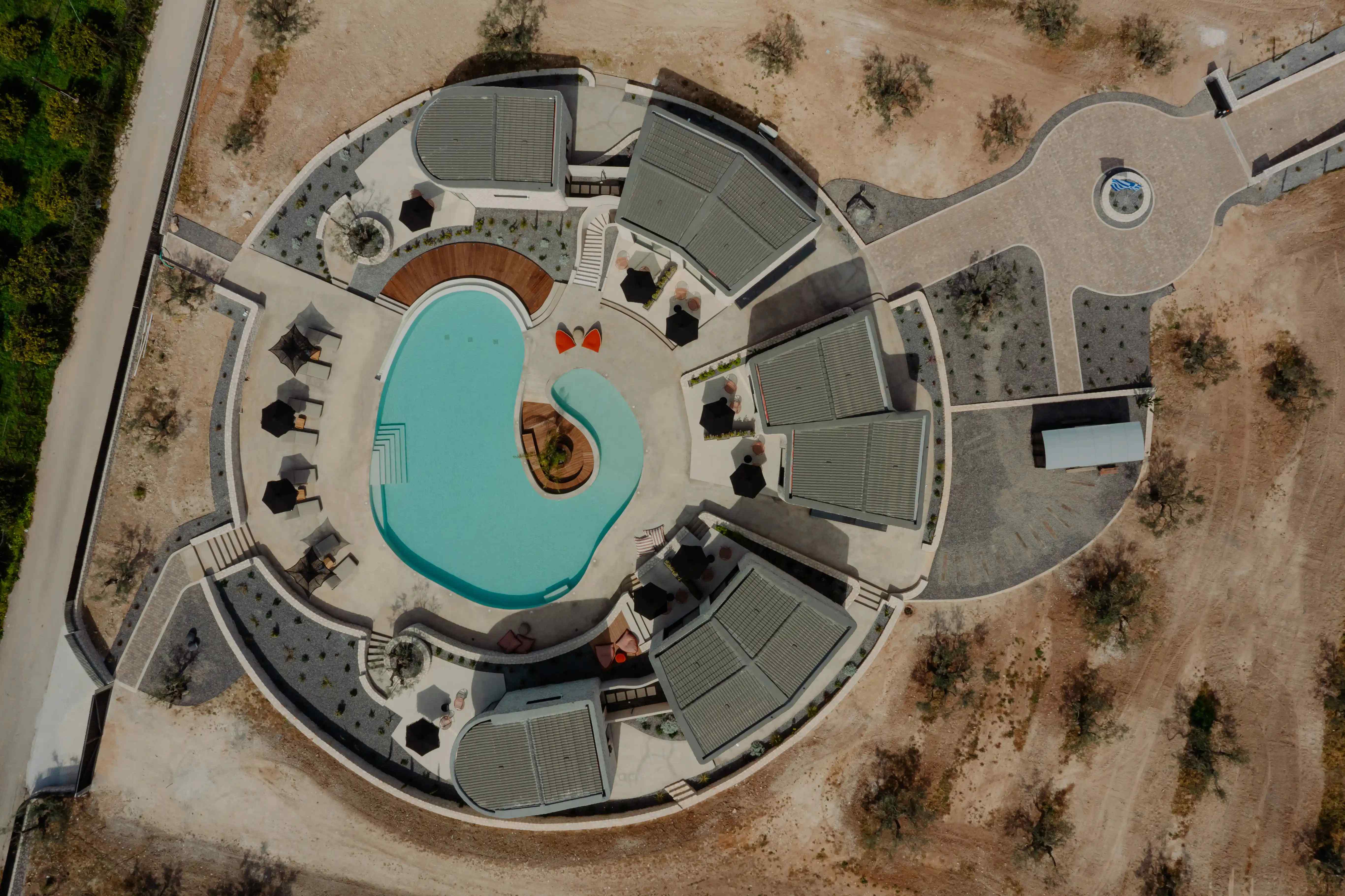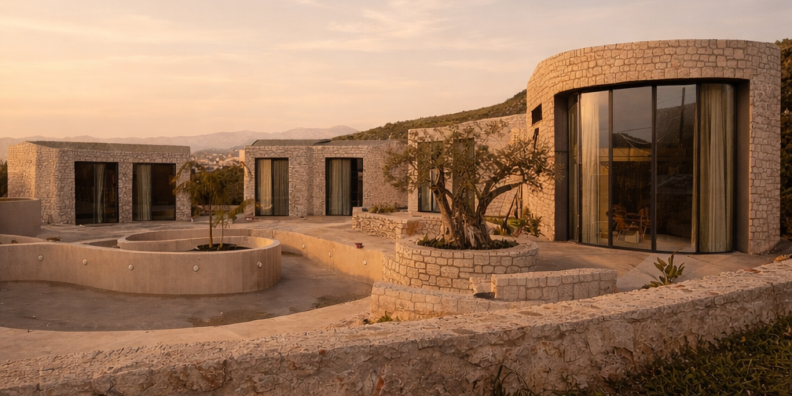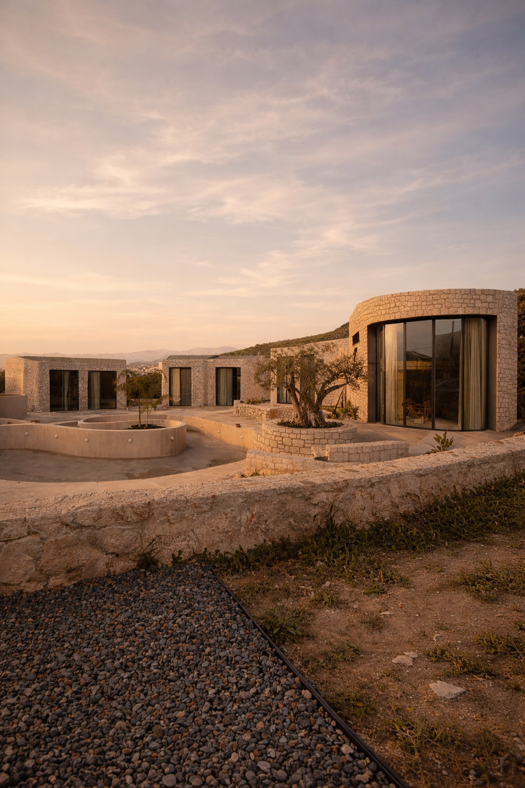 Οι όγκοι, με ήπιες καμπύλες και συμπαγή υλικότητα, εγγράφονται στη γεωμετρία του κύκλου, δημιουργώντας μια ενιαία μορφολογική γλώσσα. Η λιθοδομή και οι γήινες αποχρώσεις εντάσσουν το έργο στο μεσογειακό τοπίο, ενώ η διατήρηση της υφιστάμενης φύτευσης ενισχύει τη συνέχεια του τόπου.
