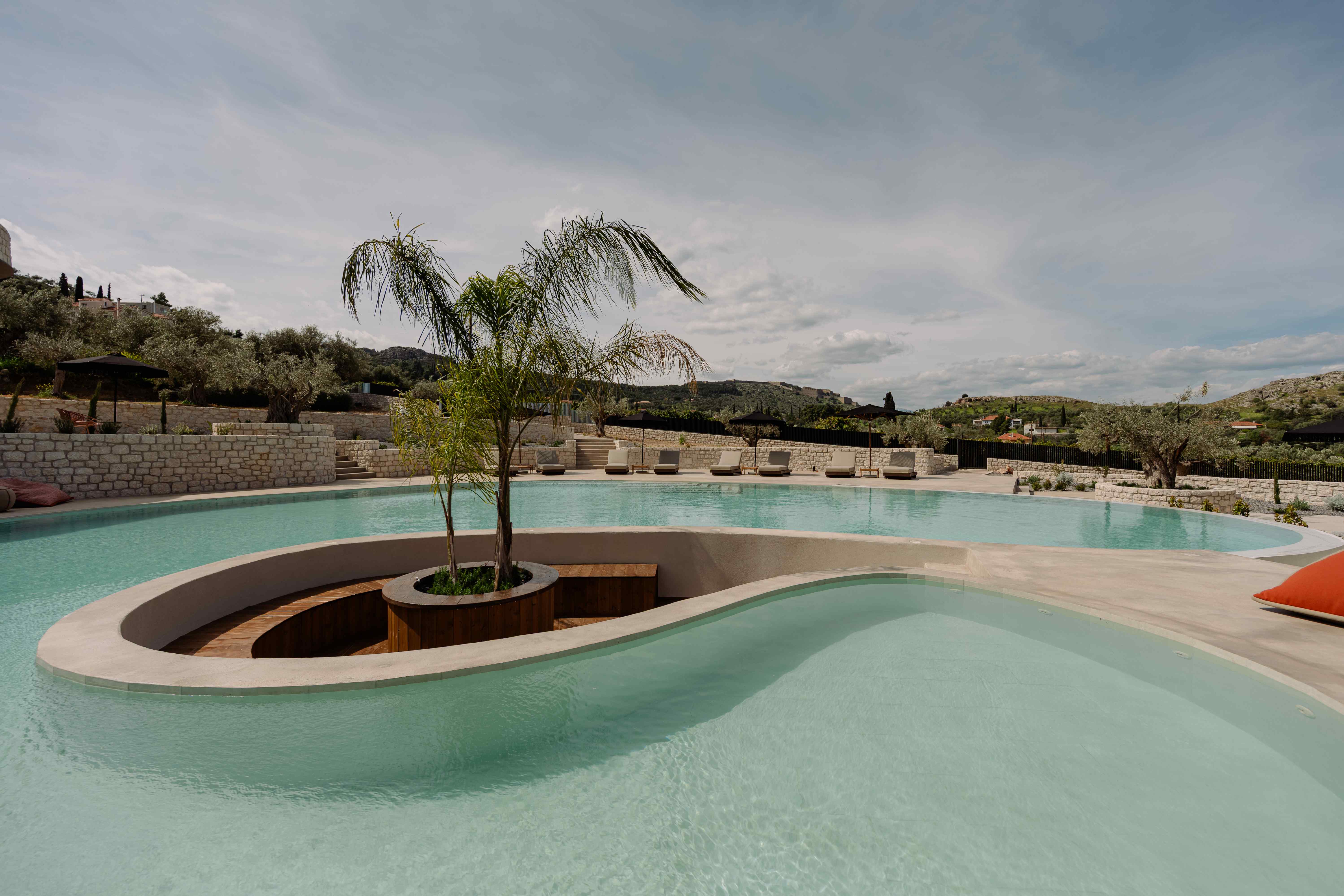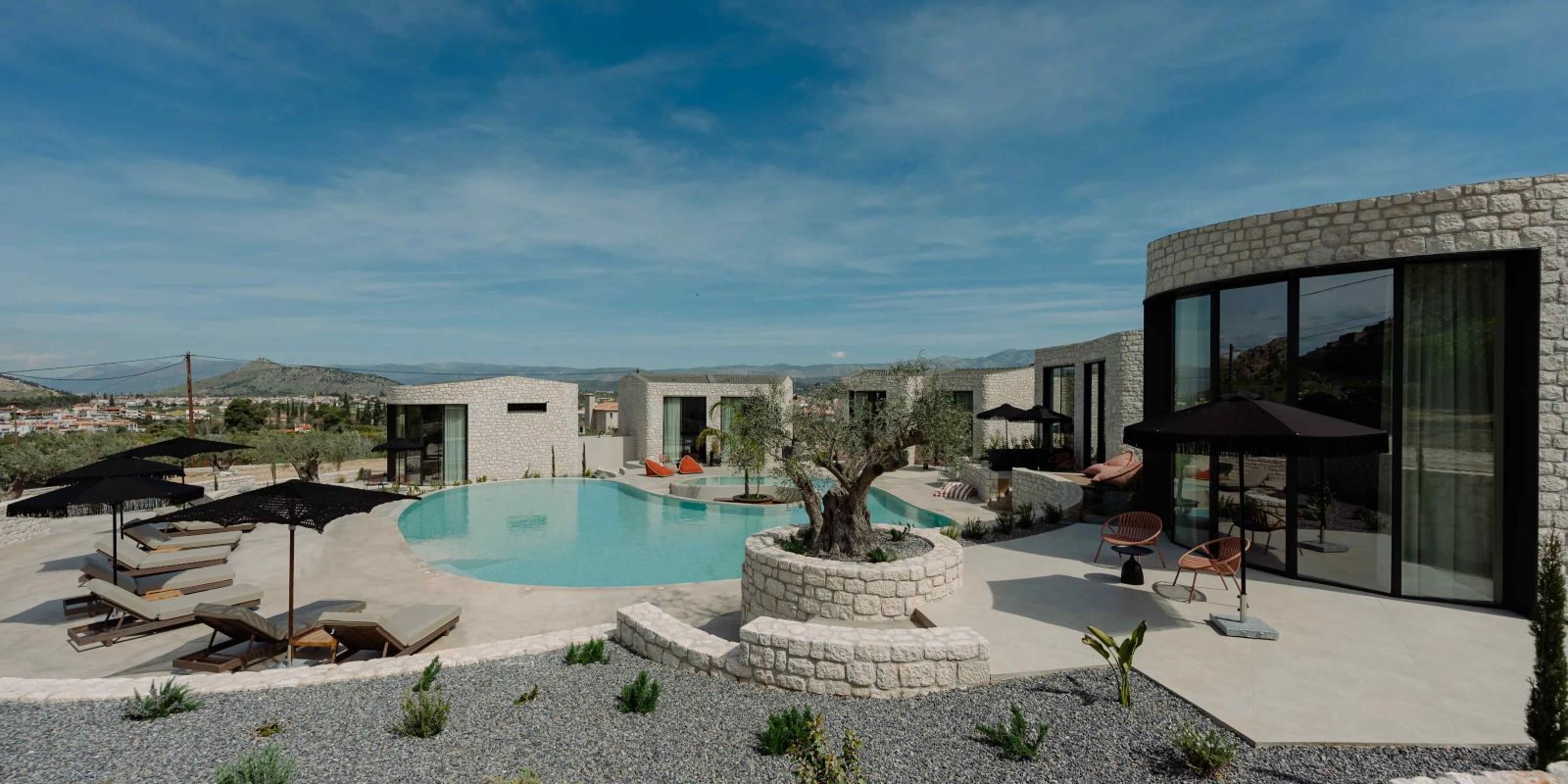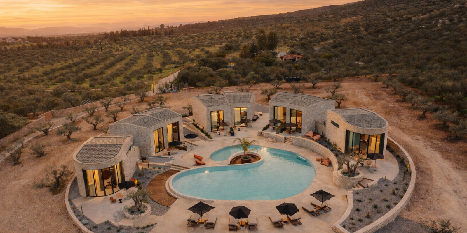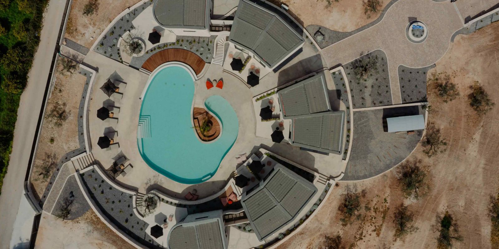 Οι όγκοι, με ήπιες καμπύλες και συμπαγή υλικότητα, εγγράφονται στη γεωμετρία του κύκλου, δημιουργώντας μια ενιαία μορφολογική γλώσσα. Η λιθοδομή και οι γήινες αποχρώσεις εντάσσουν το έργο στο μεσογειακό τοπίο, ενώ η διατήρηση της υφιστάμενης φύτευσης ενισχύει τη συνέχεια του τόπου.